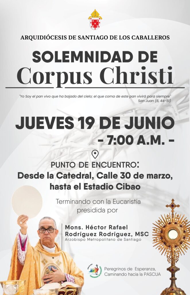 Santiago. – La Arquidiócesis de Santiago de los Caballeros celebrará la Solemnidad de Corpus Christi el próximo jueves 19 de junio, con una procesión que partirá a las 7:00 de la mañana desde la Catedral Santiago Apóstol El Mayor, y culminará con una Eucaristía solemne en el Estadio Cibao, a las 9:00 a. m., presidida por el arzobispo Héctor Rafael Rodríguez.