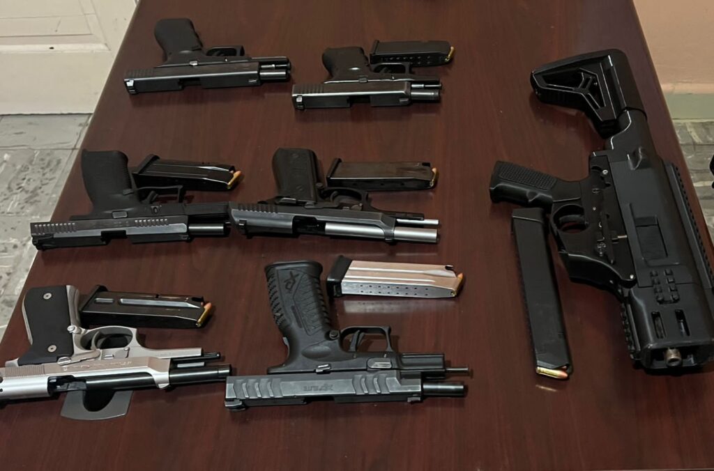 Siete armas de fuego, entre ellas pistolas Glock, CZ, Beretta, Springfield y un arma tipo Uzi, todas de 9 mm; Tres chalecos antibalas. Diez teléfonos celulares de diferentes marcas y modelos, seis pasamontañas.