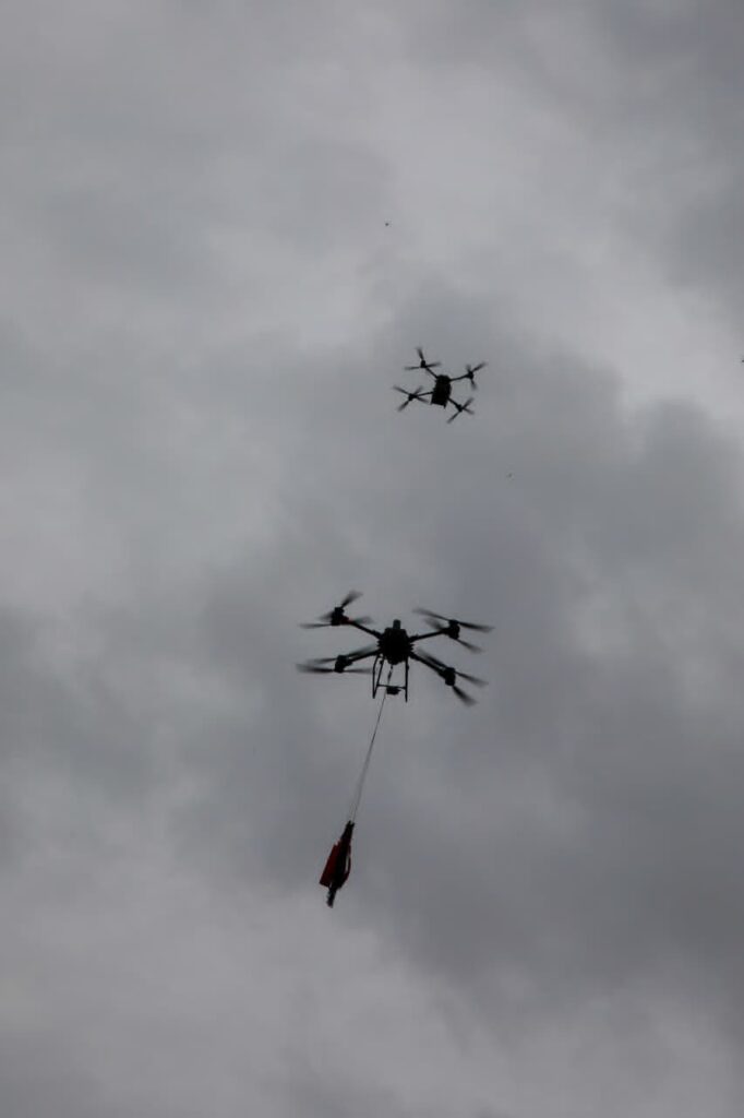 Para superar la imposibilidad de acceso terrestre, se utilizó la tecnología de drones del 911, operados por personal especializado, logrando un traslado aéreo seguro y eficiente de los alimentos.