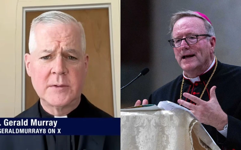 El P. Gerald Murray (izquierda) y el obispo Robert Barron. / Crédito: “The World Over with Raymond Arroyo”/Captura de pantalla; Daniel Ibañez/EWTN News.